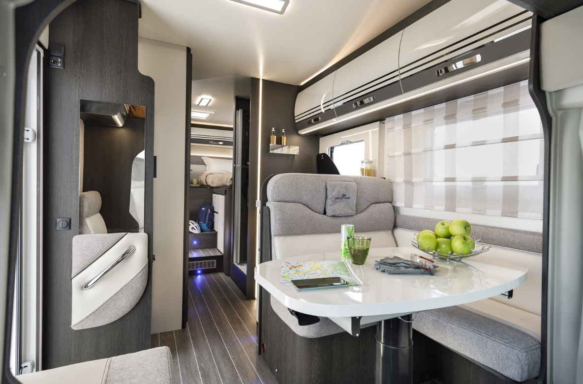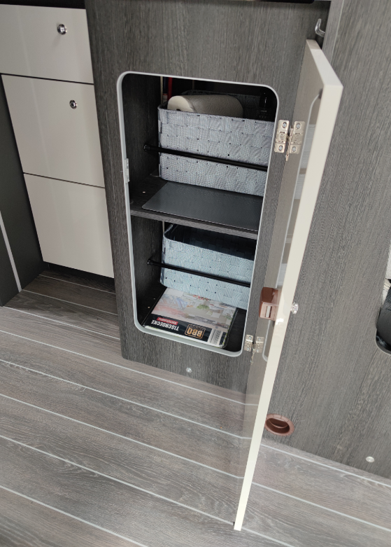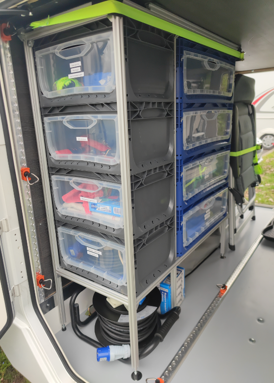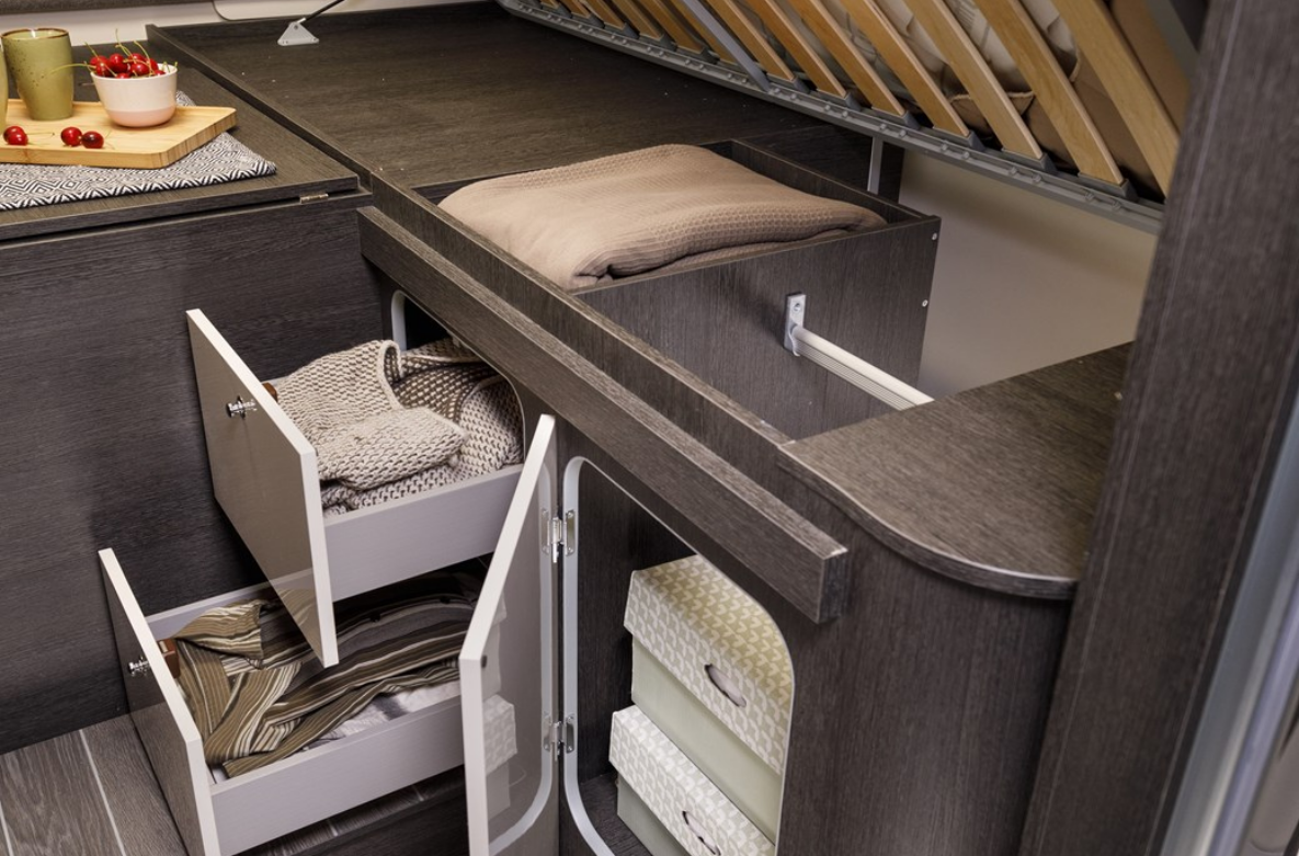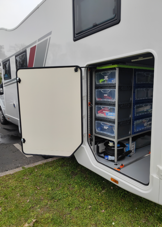 1 Schlafplatz bei abgesenktem Tisch in der SitzeckeXXL Garage mit eingebautem Ordnungssystem für das Zubehör und eigene Zuladung.