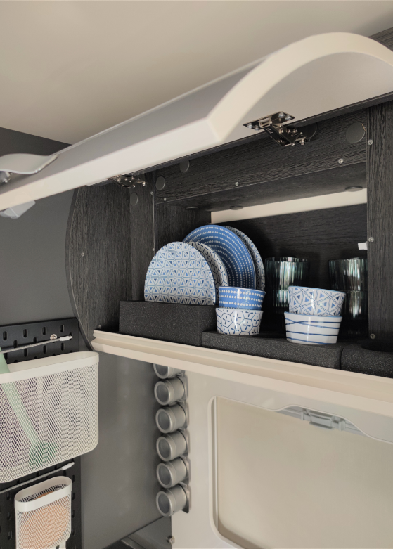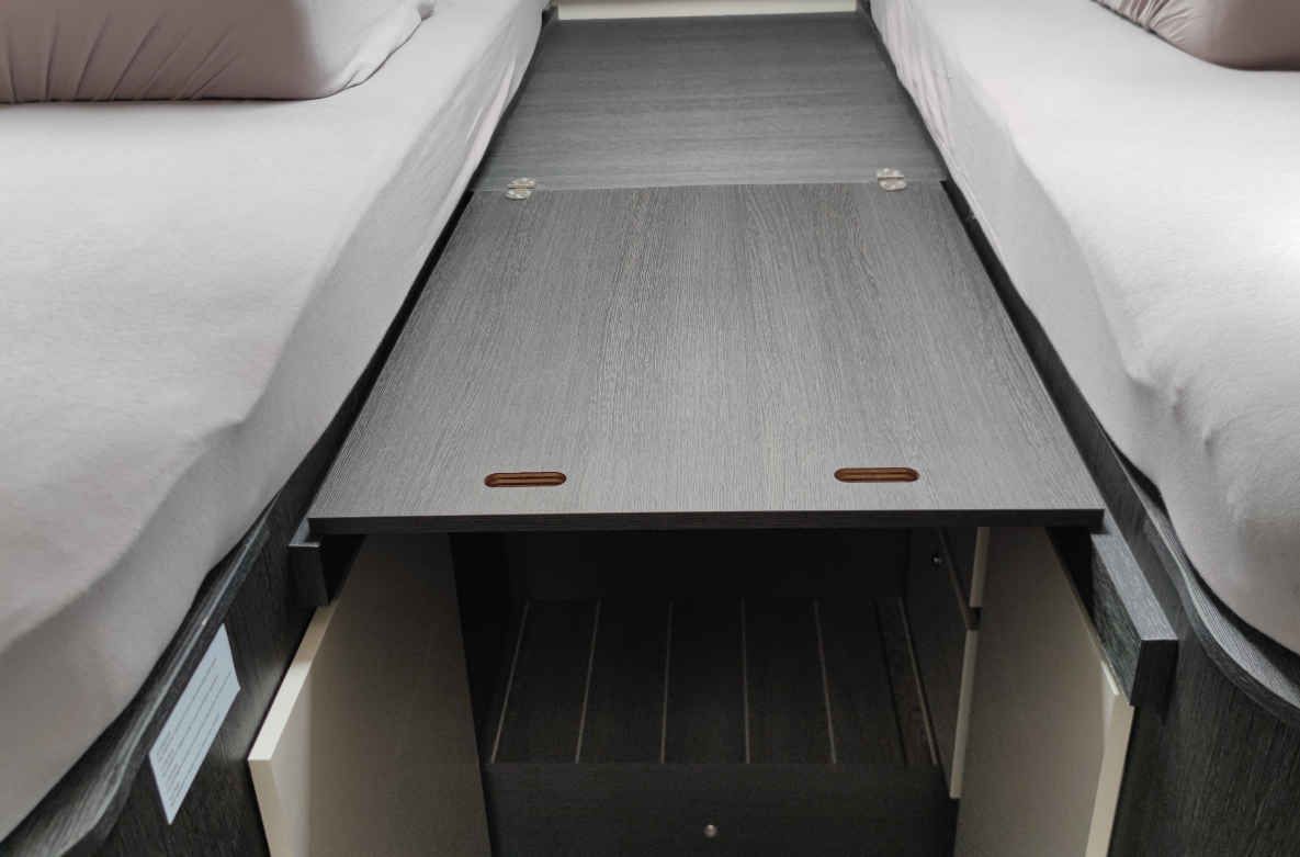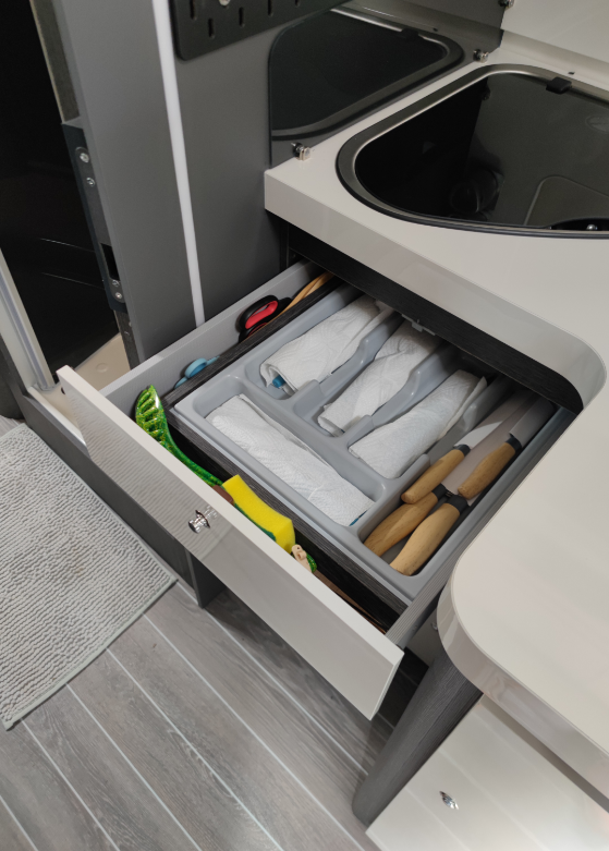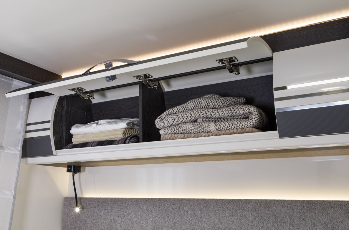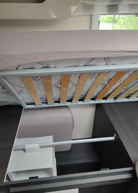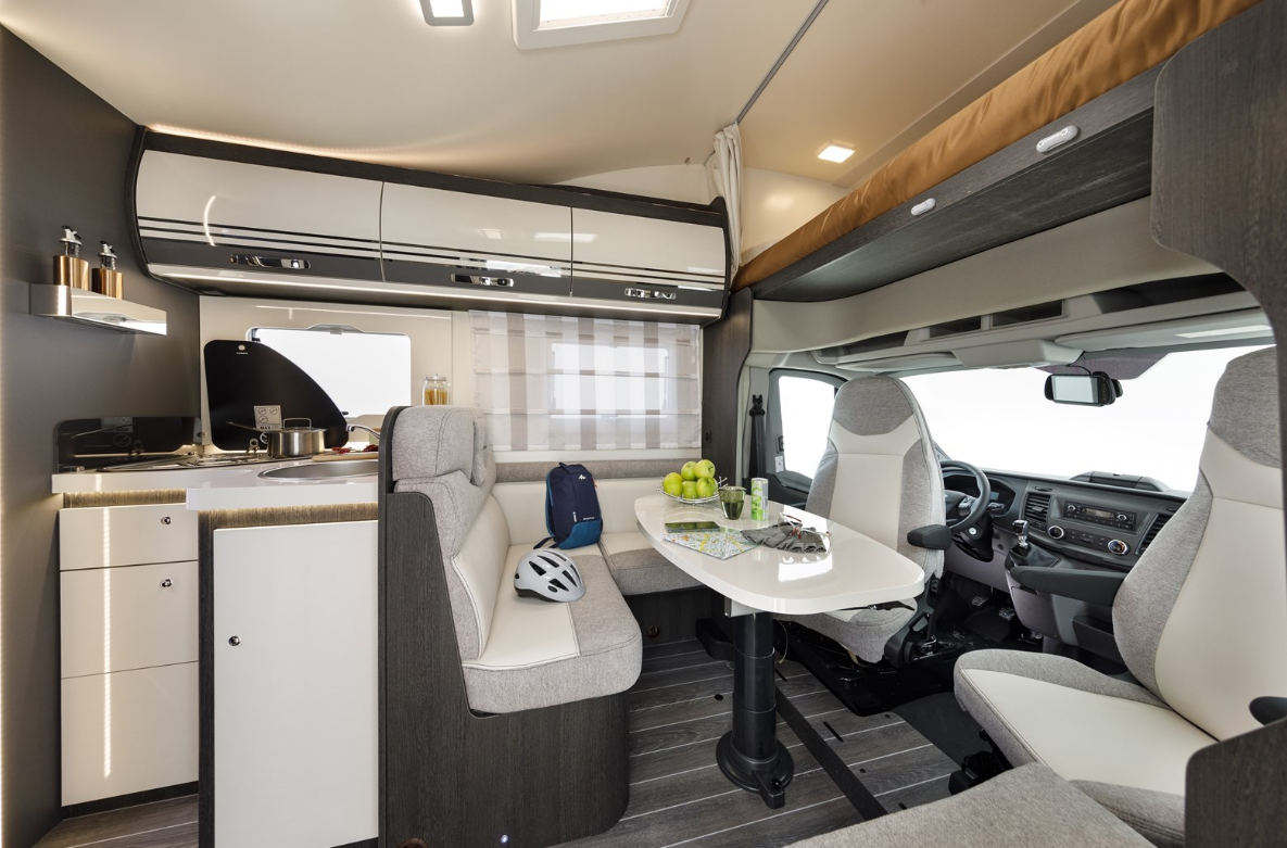 1 Schlafplatz bei abgesenktem Tisch in der SitzeckeXXL Garage mit eingebautem Ordnungssystem für das Zubehör und eigene Zuladung.